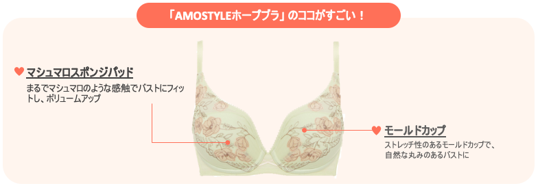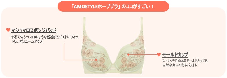 自然な丸みを生かしながらボリュームアップする「AMOSTYLEホープブラ」と、くっきり谷間を演出する「きゅっと寄せブラ」がエントリー