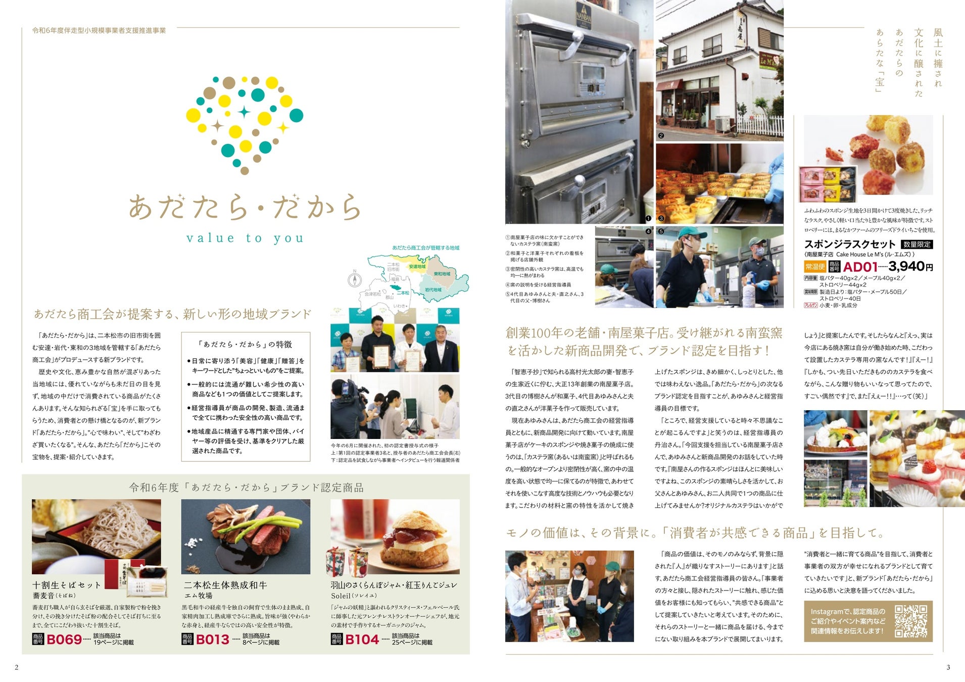 巻頭では、二本松市の安達・岩代・東和の3地域を管轄するあだたら商工会がプロデュースする新ブランド「あだたら・だから」を特集。「あだたら・だから」は、あだたら商工会が「美容」「健康」「贈答」をコンセプトに、事業者と共に商品の開発・リブランディングを行い、「安心」「安全」で「信頼性」ある唯一無二の商品をご提案するブランドです。さらに、商品を通して、作り手の想いや開発エピソードなどあだたら地域の風土が創り上げたストーリーを知って楽しんでいただくことを目的としています。特集ページでは、令和6年度認定商品と、次年度の「あだたら・だから」ブランド認定を目指す経営指導員と事業者とのエピソードを紹介しています。
