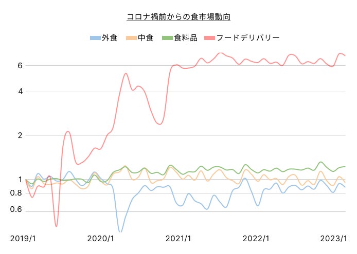 ※購買記録から「外食」「中食」「食料品」「フードデリバリー」を分類し、2019年1月の支出額を1とした対数グラフとして算出