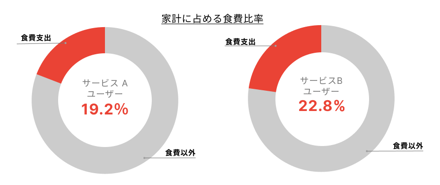 ※支出記録期間:2023年1月~4月 A・B各サービスを利用しているユーザーの家計支出のうち「食費」が占める割合を算出