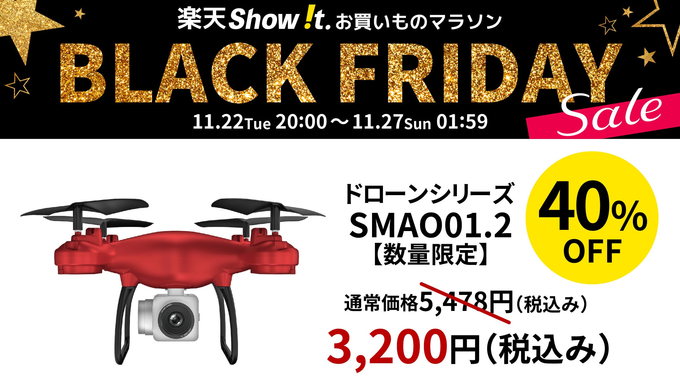 楽天「Show !t」ポイント10倍!BLACK FRIDAY SALE開催。11月22日20時、数量限定!ドローン初心者の方にもおすすめの軽量で安定飛行200万画素ドローン、40%オフセールを開始