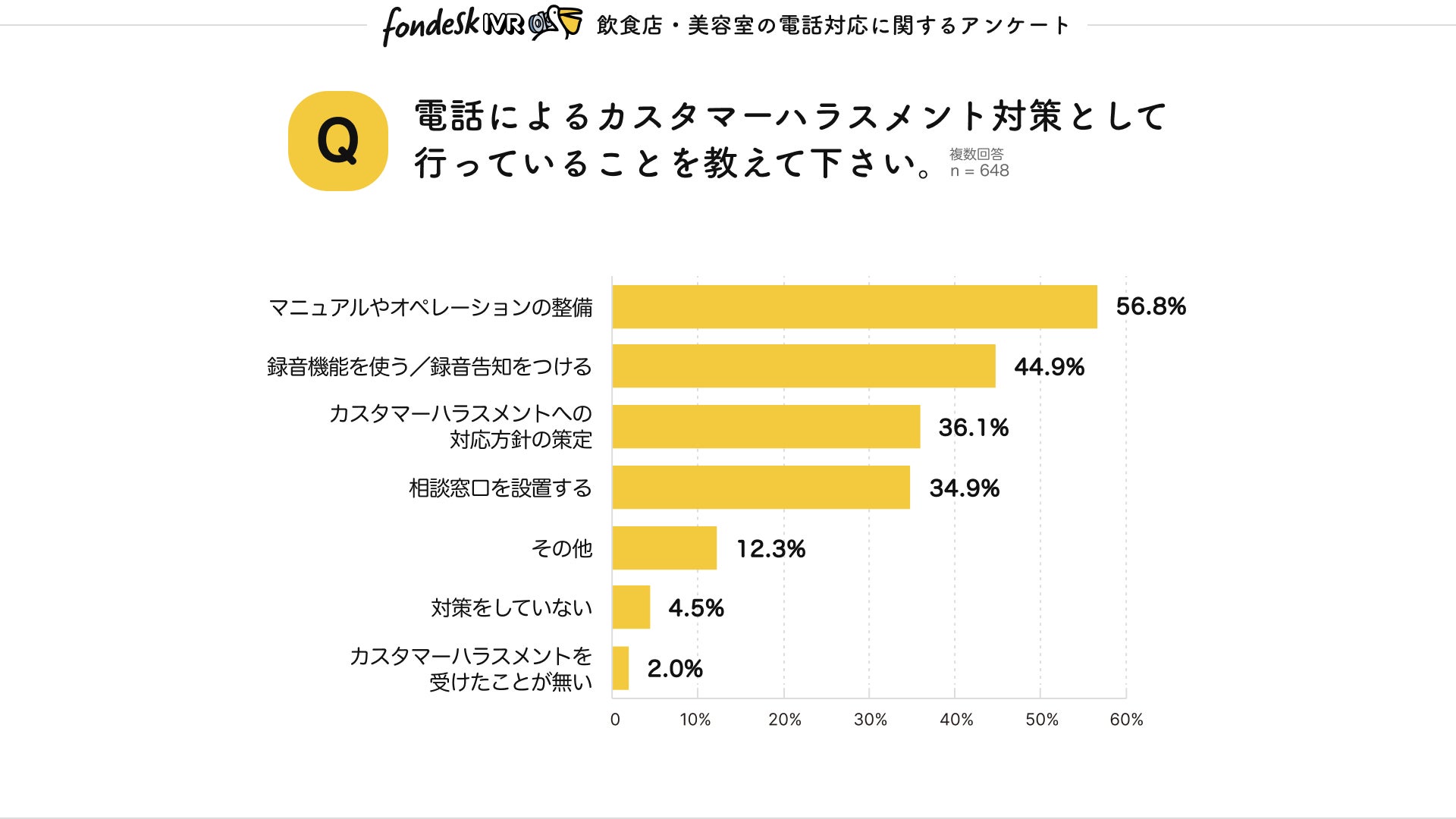 「電話によるカスタマーハラスメント対策として行っていること」について聞いたところ、「マニュアルやオペレーションの整備」が56.8%、次いで「録音機能を使う/録音告知をつける」が44.9%、「カスタマーハラスメントへの対応方針の策定」が36.1%でした。飲食店や美容室では電話によるカスタマーハラスメントが業務に支障をきたす恐れがあることから、何かしらの対策を講じていることがうかがえます。また電話による「カスタマーハラスメントを受けたことがない」という回答は2.0%でした。