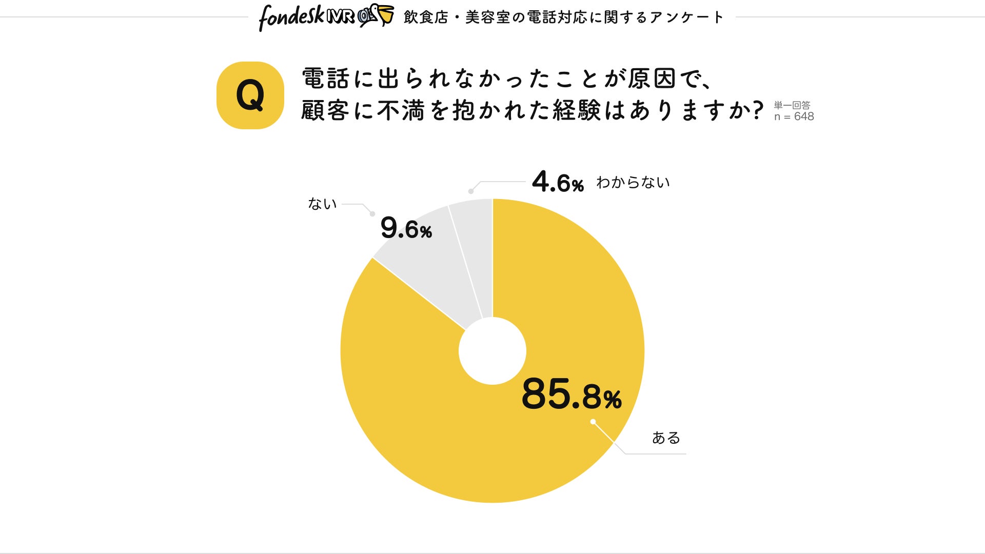 「電話に出られなかったことが原因で、顧客に不満を抱かれた経験はあるか」について聞いたところ、8割以上(85.8%)が「ある」と回答しました。このことから、電話対応は顧客満足度に影響すると考えられます。また前段の結果から、通常業務の遅れを引き起こしている実態や、コア業務以外の業務の中で時間がかかると感じる人が一定数いることを踏まえると、飲食店・美容室における電話対応業務は改善の余地があることがわかります。