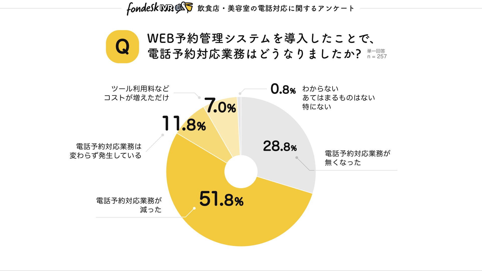 「WEB予約管理システムを導入したことで、電話予約対応業務がどうなったか」について聞いたところ、「電話予約対応業務が無くなった」という回答は28.8%でした。「電話予約対応業務が減った」「電話予約対応は変わらず発生している」「ツール利用料などコストが増えただけ」と回答した方の合計は7割以上(70.6%)という結果から、WEB予約管理システムを導入しても電話予約の対応が依然として「ある」ことがわかります。