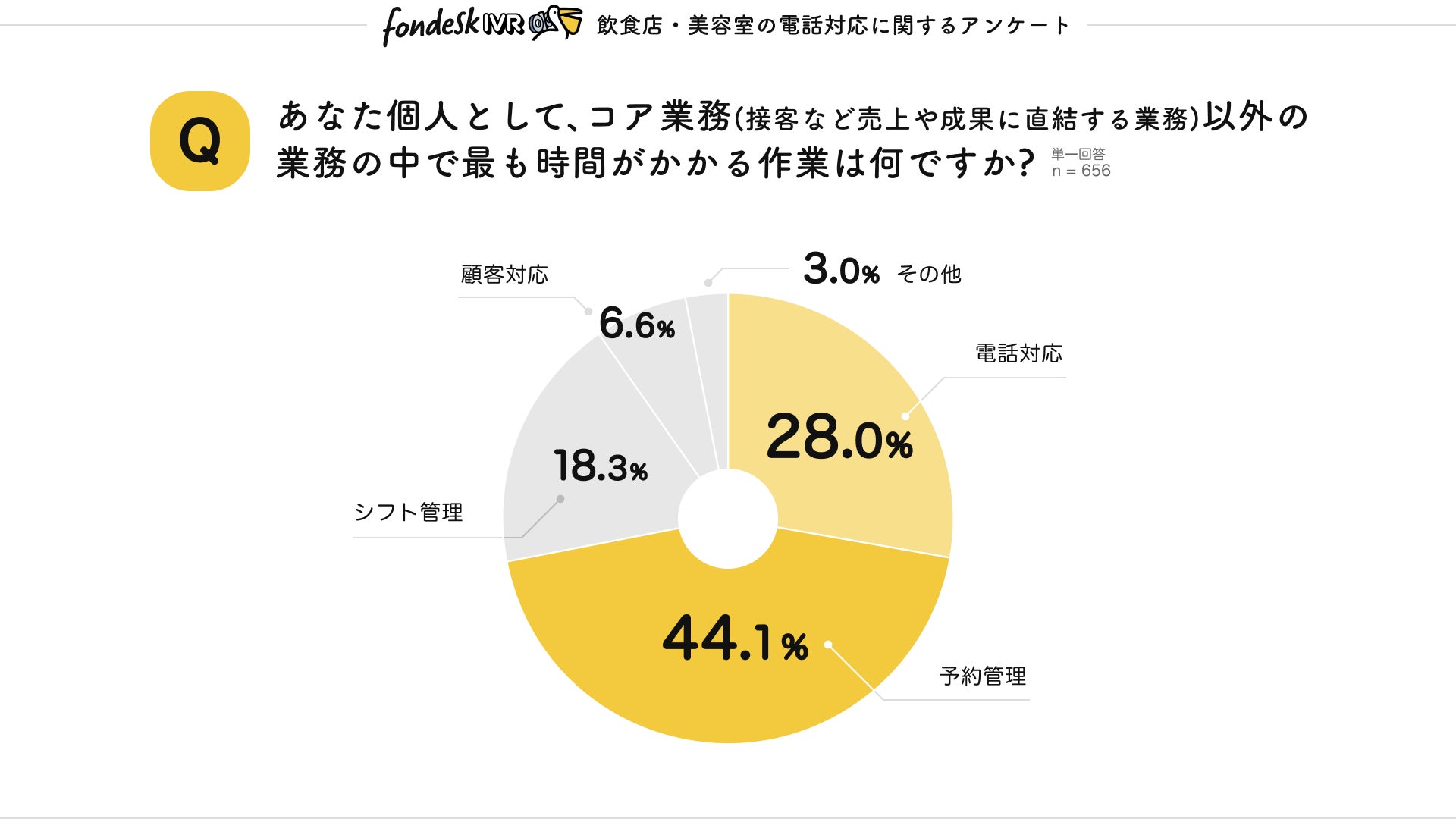「あなた個人として、コア業務(接客など売り上げや成果に直結する業務)以外の業務の中で最も時間がかかる作業は何か?」について質問したところ、44.1%が「予約管理」と回答し、次いで約3割(28.0%)が「電話対応」と回答しました。