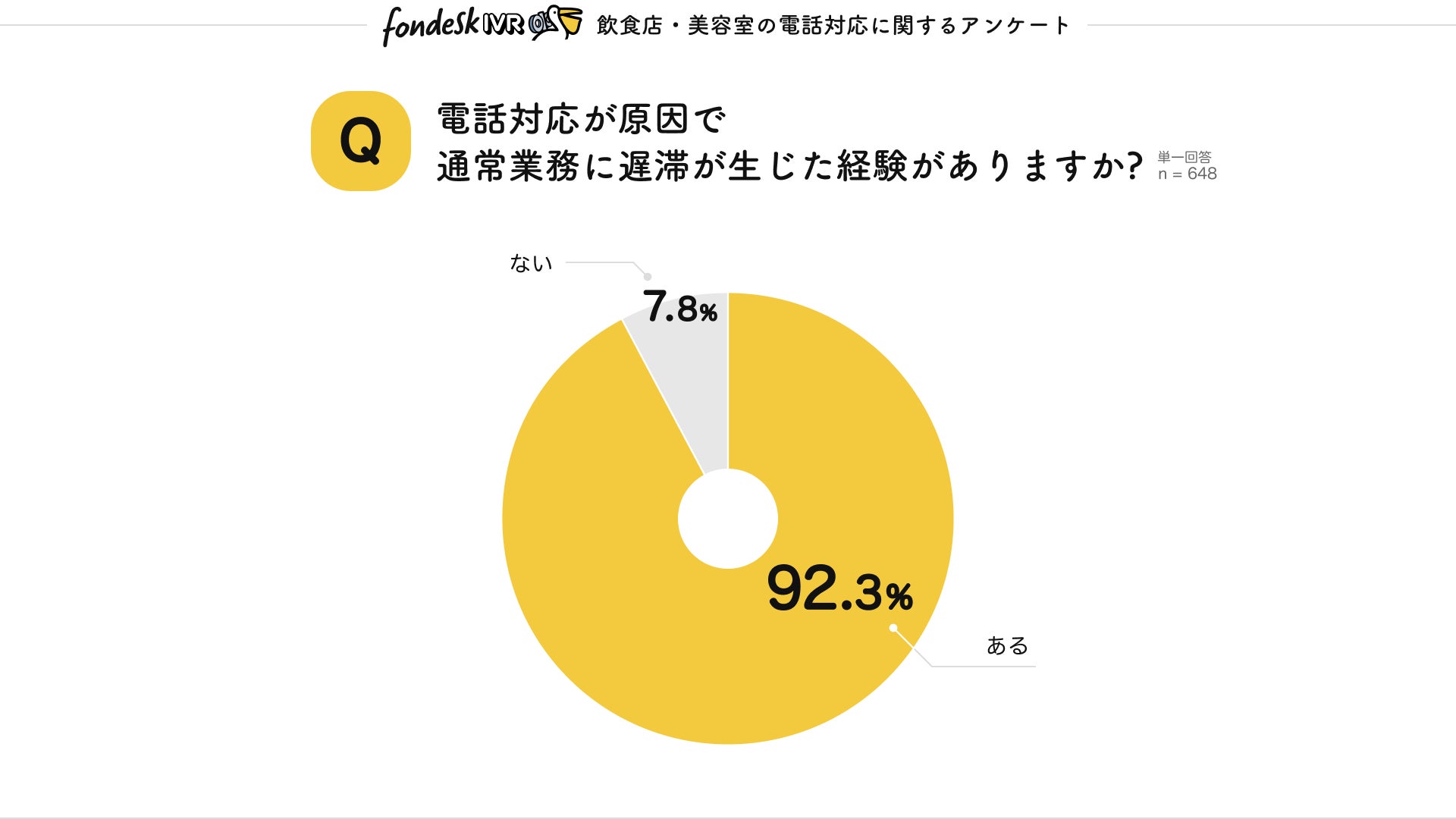 「電話対応が原因で通常業務に遅滞が生じた経験があるか」について聞いたところ、9割以上(92.3%)が「ある」と回答しました。