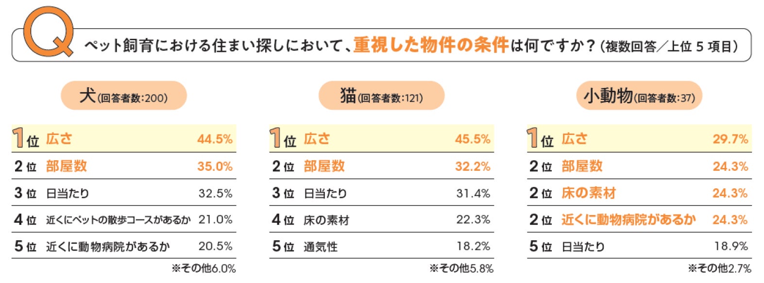 ペット飼育における住まい探しにおいて、重視した物件の条件を聞いたところ、いずれのペット飼育者も「広さ」を重視する傾向にありました。また犬の飼育者の約2割は「近くにペットの散歩コースがあるか」で、散歩が欠かせない犬の飼育において、周辺環境の充実さが求められるようです。なお、鳥・爬虫類・魚に関してはいずれも「広さ」「部屋数」「日当たり」がトップ3にランクインしました。
