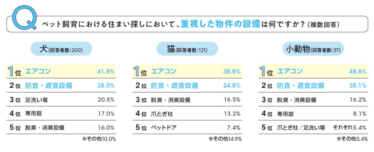 「エアコン」は、犬・猫・小動物を飼育する上で最も重視する設備でした。他に、亀や魚を飼っている人からも「温度や湿度調整で必要」「環境の管理がしやすい」など、ペット飼育において温度や湿度管理などの観点でニーズの高い設備であることが分かりました。