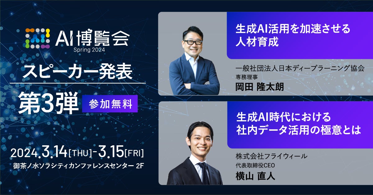 AI博覧会、第3弾スピーカーを発表!JDLA 岡田氏、フライウィール 横山氏が講演!