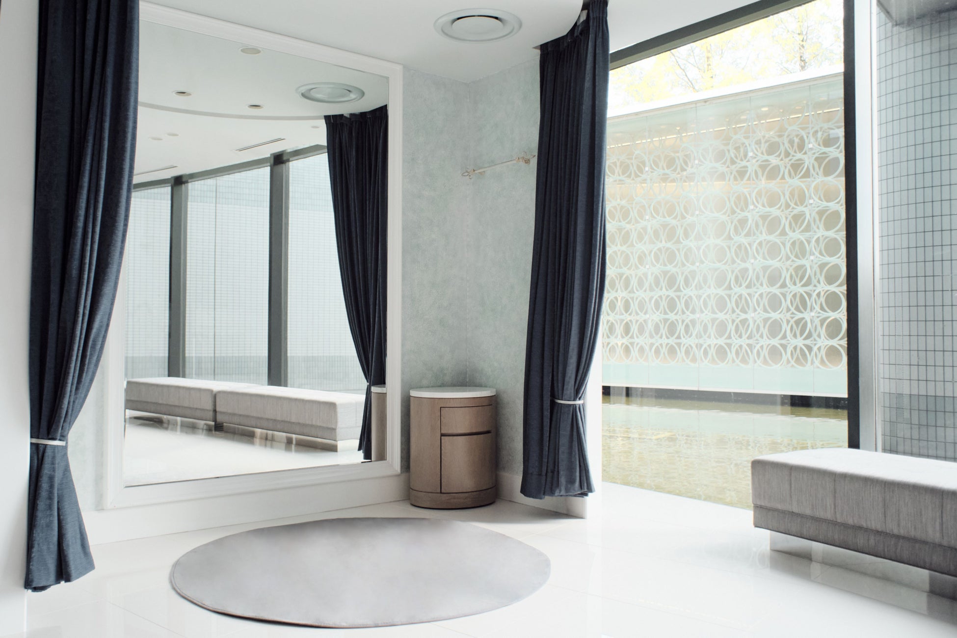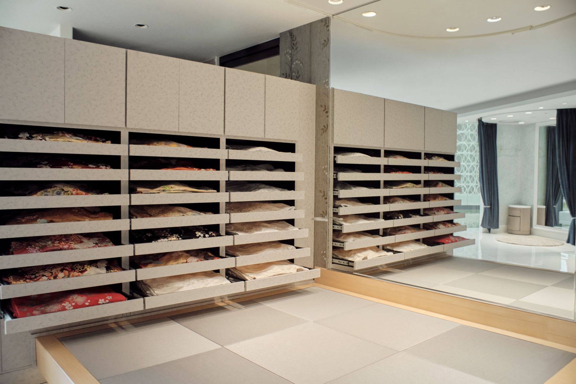 新郎・新婦さまをお迎えするエントランスディスプレイは、クラシックでありながらシャンデリアの柔らかな光に包まれた煌めくドレスたちが出迎えます。ミニマルかつシンプルな空間を演出いたしました。店内の中央には上質でくつろげるラウンジスペースや、完全個室のブライダルフィッティングルーム4室完備し、特別な時間をひとり占めにできます。