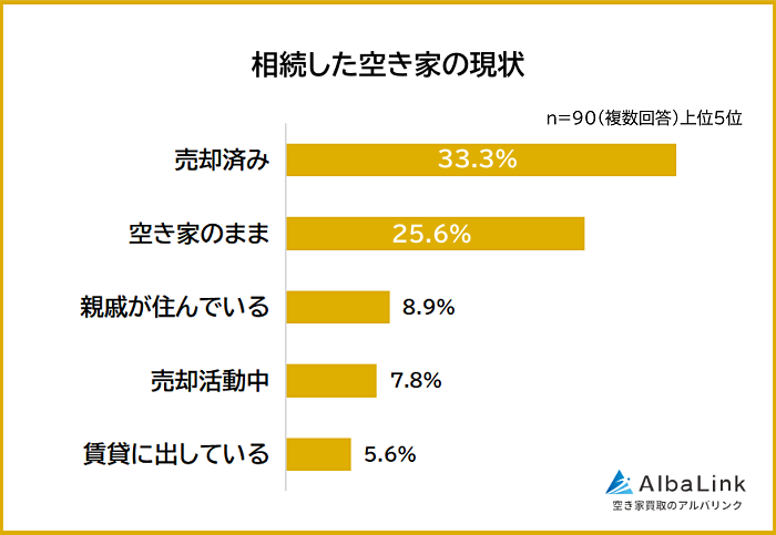 空き家を所有したことがある90人に「相続した空き家の現状」を聞いたところ、1位は「売却済み(33.3%)」で、3割以上の人がすでに空き家を手放していました。一方で2位「空き家のまま(25.6%)」という人も多くなっています。