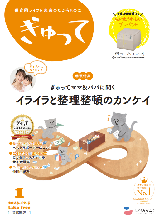 全国私立保育園連盟をはじめ、協議会・団体・行政の承認・協力を得て、毎月1回(地域により異なる)、首都圏・関西圏・東海圏の保育園で計約35万配布しています。独自の編集方針で保育園や園児とその保護者から信頼を得ることをモットーに、仕事と 子育ての両立、時短など働くママ・パパの気持ちに寄り添う特集、連載を展開しています。https://gyutte.jp/magazine