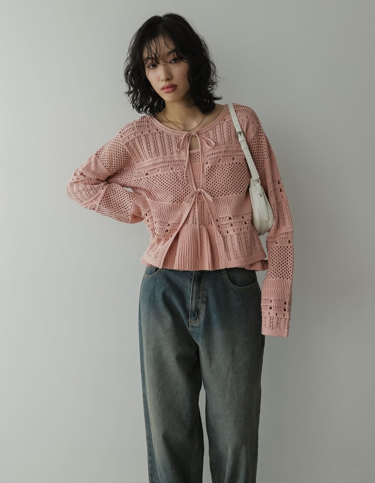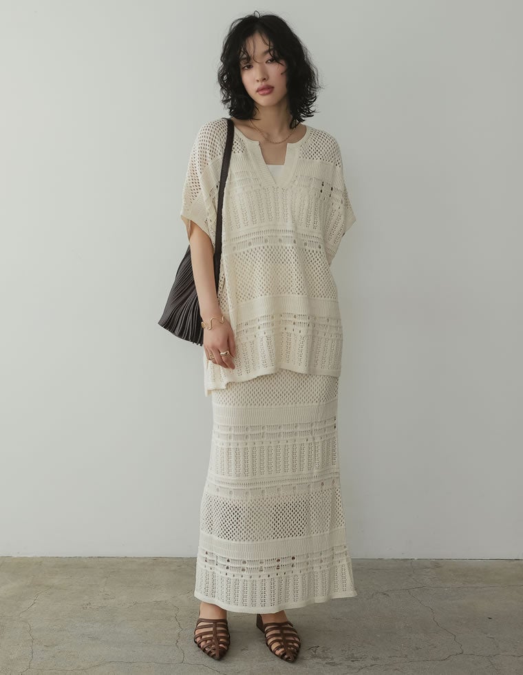 程良くシアー感のあるコットン100%透かし編みニットで、シーズンライクなスタイリングがお楽しみいただけます。