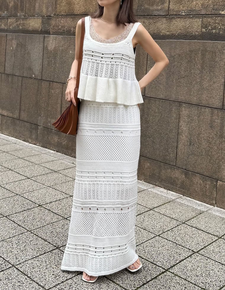 たっぷりと用尺のあるフレアシルエットを描くニットビスチェは、フェミニンな魅力を演出してくれます。