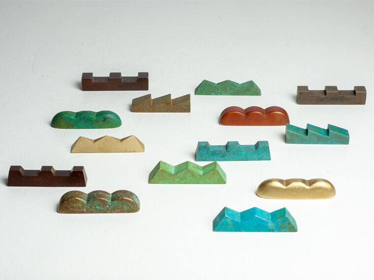 山並みをイメージした筆置き「HIKKA -oyama-」。2本の筆を置くことができ、オブジェとしても飾って楽しめます。表面塗装は行なっていますが、経年変化により表面の色味の変化を楽しめるのが魅力的です。