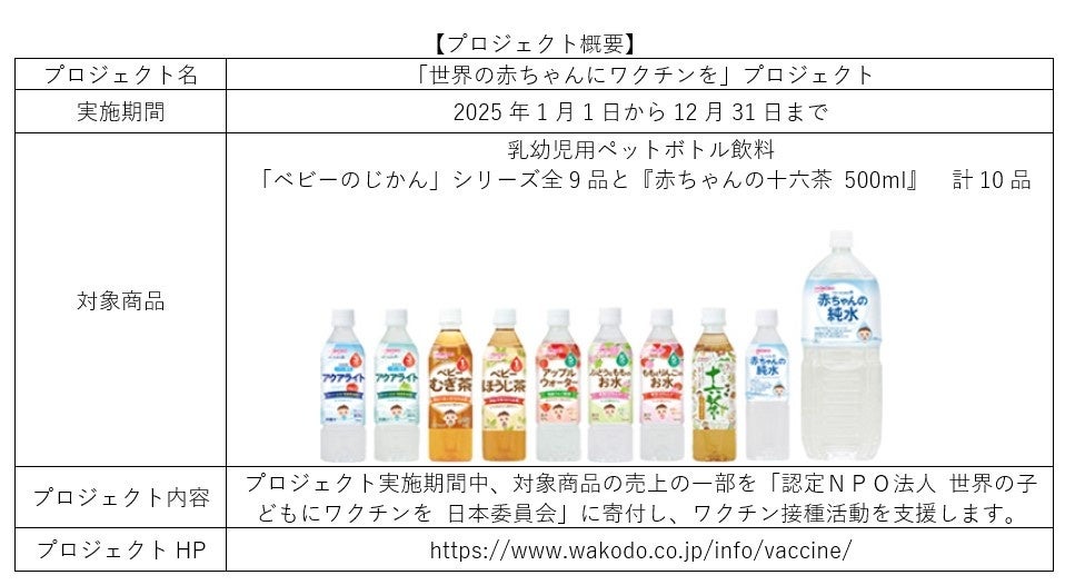 プロジェクトは、期間中にお客さまにご購入いただいた和光堂ブランドの乳幼児用ペットボトル飲料「ベビーのじかん」シリーズ全9品と『赤ちゃんの十六茶500ml』の計10品の売上の一部を「認定NPO法人 世界の子どもにワクチンを 日本委員会」に寄付することで、ワクチンが不足している開発途上国のワクチン接種活動を支援するものです。