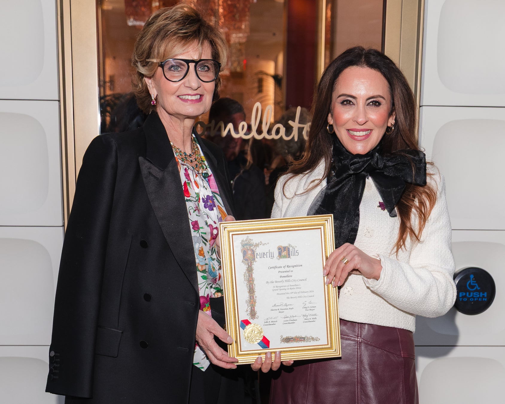 同日午後、ジェーン・フォンダ、フィリピーヌ・ルロワ=ボリュー、ケリー・ワシントン、そしてビバリーヒルズ市長シャローナ・ナザリアンが参加し、ポメラートの新しいビバリーヒルズ旗艦店のテープカットセレモニーが行われました。ロデオドライブ445番地に位置するこのブティックは、ブランドの美学とカリフォルニアのクリエイティブカルチャーとの対話を反映しています。ミラノのポメラート建築チームが手掛けた空間は、「Golden Eclectic(光り輝く折衷美の世界)」というビジョンのもと、イタリアの芸術性とロサンゼルスのモダニティを融合。触感豊かな素材、重層的な質感、そして彫刻的フォルムが印象的な空間に仕上げられています。