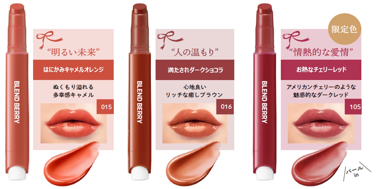 2023年に発売して以来、「むっちりとした唇になる」、「発色がよい」など、ご好評の声を多数頂いています。今回のコレクションでは、秋のトレンドを抑えつつ、ブレンドベリーらしい可愛らしさも兼ね備えた温かみのある3色をラインナップしました。