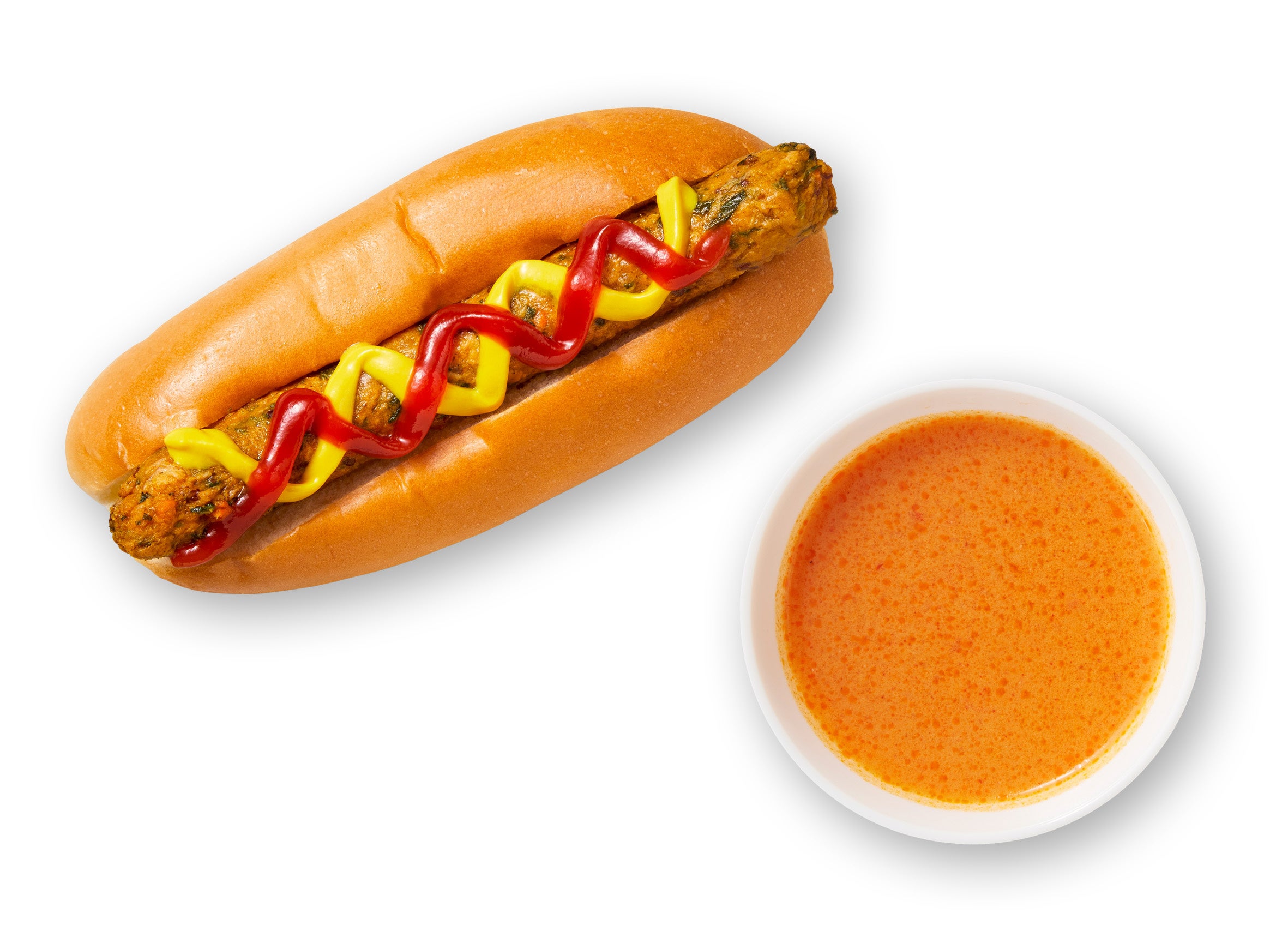 イケア店舗内のスウェーデンビストロで大人気。ケールやニンジンなどタンパク質が豊富な植物由来の材料からつくられたベジタブルソーセージを使用したホットドッグに、オマール海老のビスクをセットにしました。
