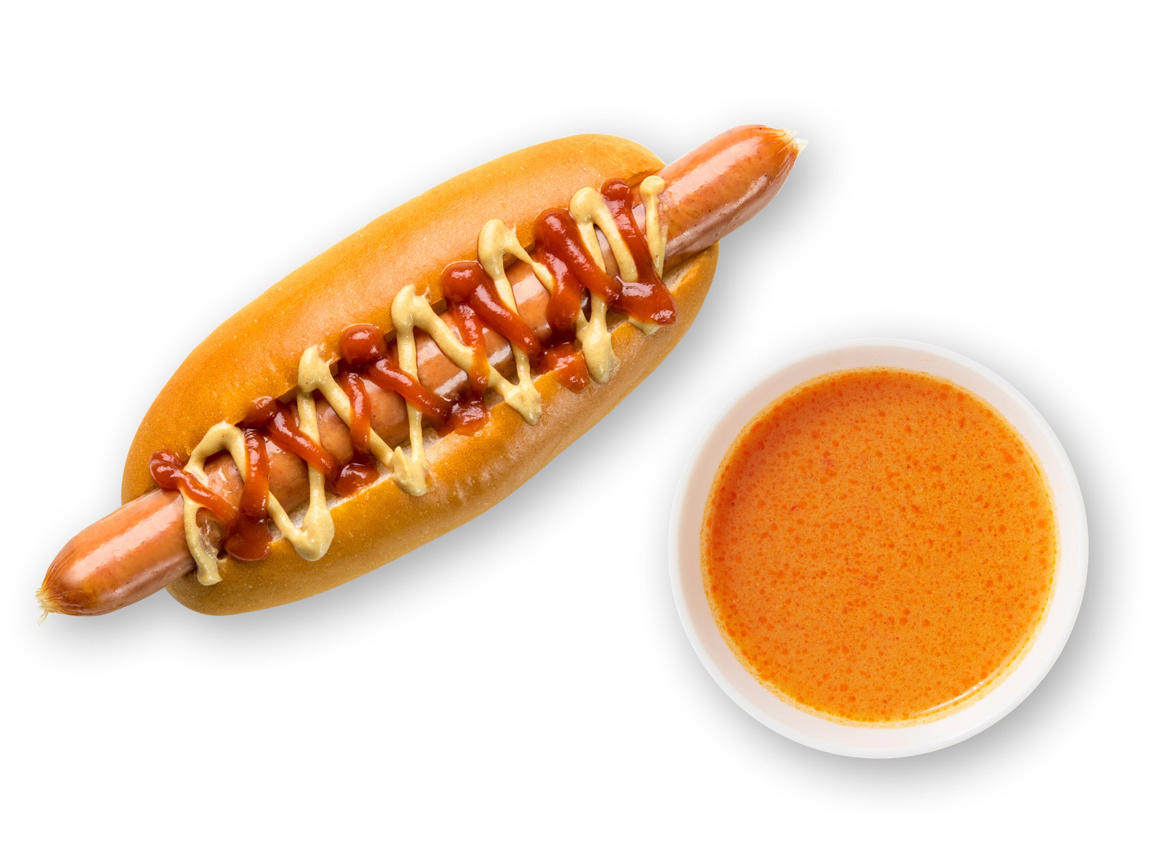イケア店舗内のスウェーデンビストロで大人気。外側はパリッと内側はジューシーなソーセージのホットドッグに、持続可能な漁場から取得されたオマール海老のビスクをセットにしました。