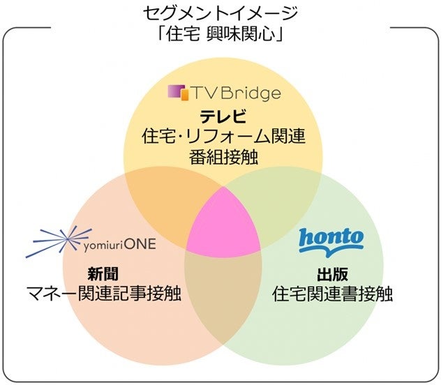 読売新聞グループの新聞読者をベースとした420万IDのデータ基盤「yomiuri ONE」※1と、SMNが活用可能なインターネット接続テレビ約900万台の視聴データ「Connected TV Data Bridge(「TVBridge」)」※2が既に連携しており、ここに今回、会員数760万人のDNPグループのハイブリッド型総合書店「honto」※3のアクセスデータを新たに連携させます。これにより、新聞・出版物(雑誌等)・テレビの3種類のマスメディアを横断するデータマーケティングを実現します。