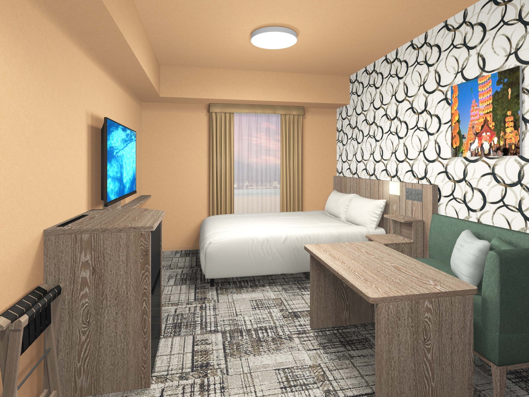 客室は、おひとり様でもゆったりとお過ごしいただける「ダブルルーム(ベッド幅150㎝ 約15.5m²~17.3m²)」と、ゆとりのある「ツインルーム(ベッド幅110㎝ 約18 m²~21.1m²)」を中心にご用意いたします。当社グループホテルが大切にしている“1㎝ の快適性”を追求して寛ぎのひとときをお過ごしいただける空間づくりにこだわり、全室にサータ社製の快眠ベッドを導入、大きなテーブルやソファを備えました。また、全客室に電子レンジ、2ドア冷蔵庫、大型スマートテレビ、加湿機能付き空気清浄機を完備し、快適なご滞在をサポートいたします。長期滞在のお客様には、キッチンや洗濯機を備えた客室もご用意いたします。また、最大4名様までご利用可能な広々とした「和モダンファミリールーム(約27.9 m²)」は、畳調の床材を使用し、靴を脱いでお寛ぎいただけます。明るく開放感がある客室で、お子様連れやグループのお客様にもおすすめです。