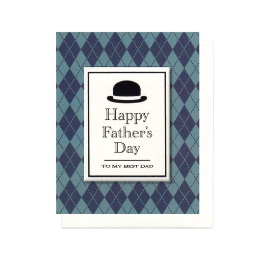 黒箔で印刷された高級感のあるラベルが特長の、ブルーのアーガイル模様と山高帽がカワイイ父の日ミニカード。