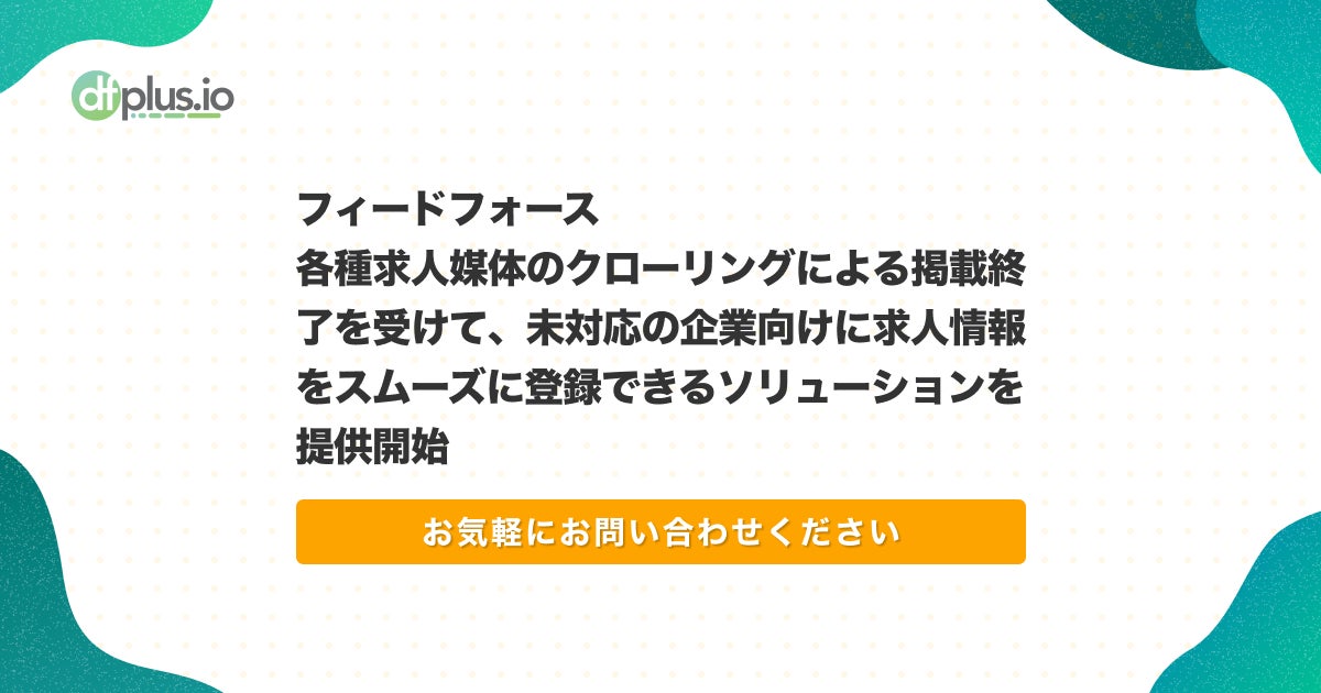 各種求人媒体のクローリングによる掲載終了の影響を受ける企業さま向けに、フィードフォースではdfplus.ioを活用した求人情報管理・配信のサポートを強化しております。特に、自社で採用サイトを運用している企業や、求人情報の掲載フローを見直す必要がある企業さまは、ぜひこの機会にお問い合わせください。