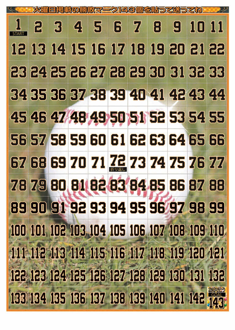 一昨年、昨年行い、大変好評だった台紙紙面にマークを貼るプレゼント企画を、今年も行います。3月31日(金)に開幕するセ・リーグ公式戦の最終試合143試合目まで、143枚の勝敗マークを、紙面台紙に貼付してお送りいただいただく企画です。