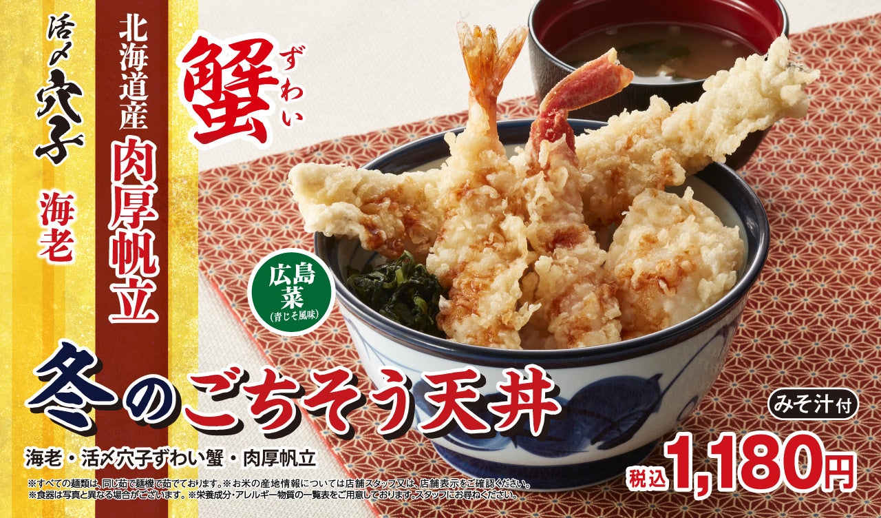 旬の贅沢な素材をのっけた「ごちそうシリーズ」。旨みが詰まった大きな「北海道産肉厚帆立」、冬の定番「ずわい蟹」、ふんわりとし た「活〆穴子」、人気の「海老」の天ぷらと、箸休めにたれとの相性が抜群な青じそ風味の「広島菜漬け」を添えました。冬ならで はの海の幸を堪能できる豪華な天丼です。
