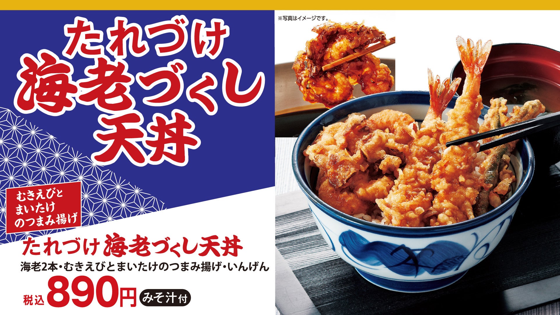 揚げたての天ぷらに甘辛い丼たれをまとわせて、しっかりとした味付けが人気の "たれづけシリーズ"の新作。人気の「海老」を2尾、プリプリ食感と香り豊かな「むきえびとまいたけのつまみ揚げ」、彩りの「いんげん」の天ぷらを”たれづけ”にしました。海老を存分に味わえる天丼です。