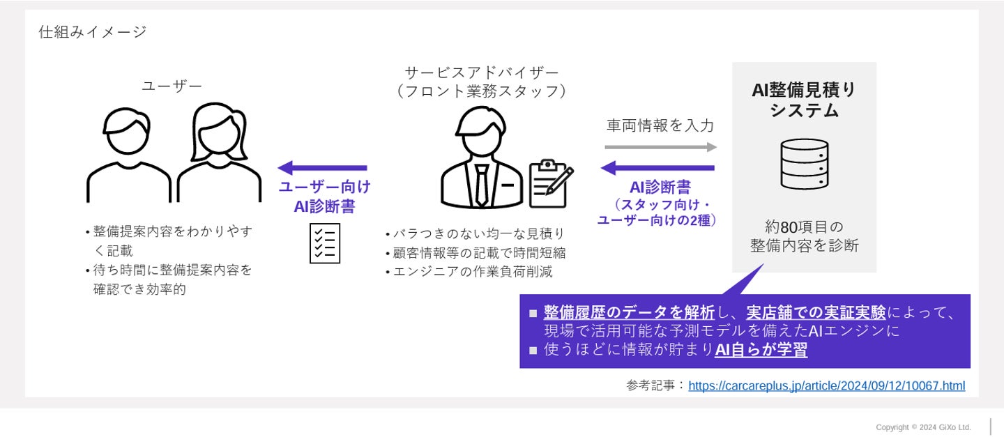 ※3 参考:ギックスとトヨタモビリティパーツ、「AI整備見積りシステム」を共同提供開始(2024.04.08)https://www.gixo.jp/news-press/24294/