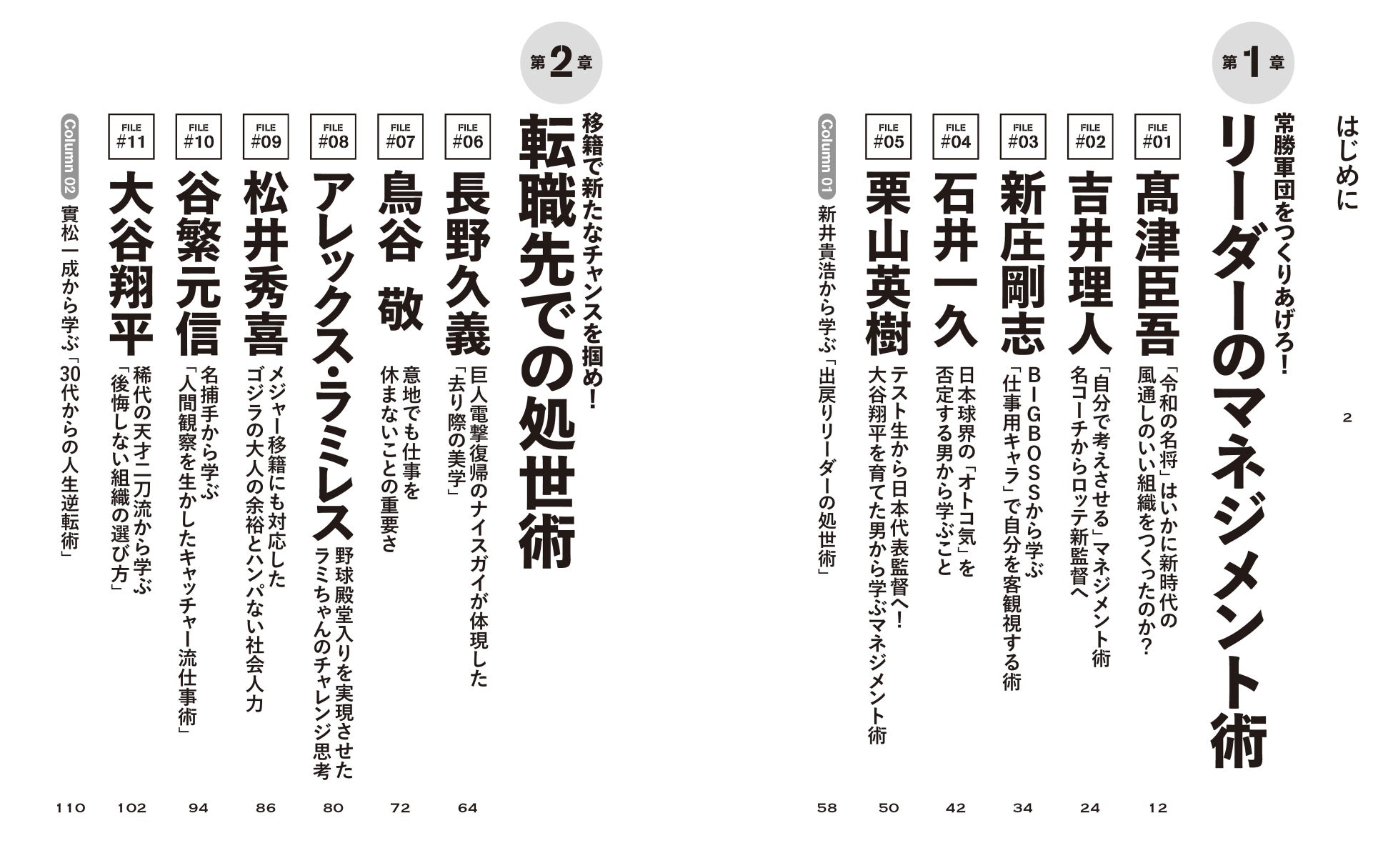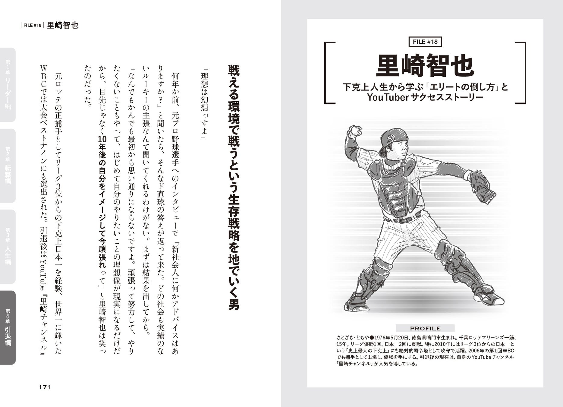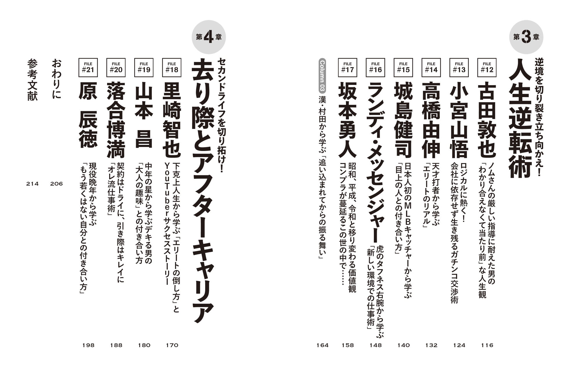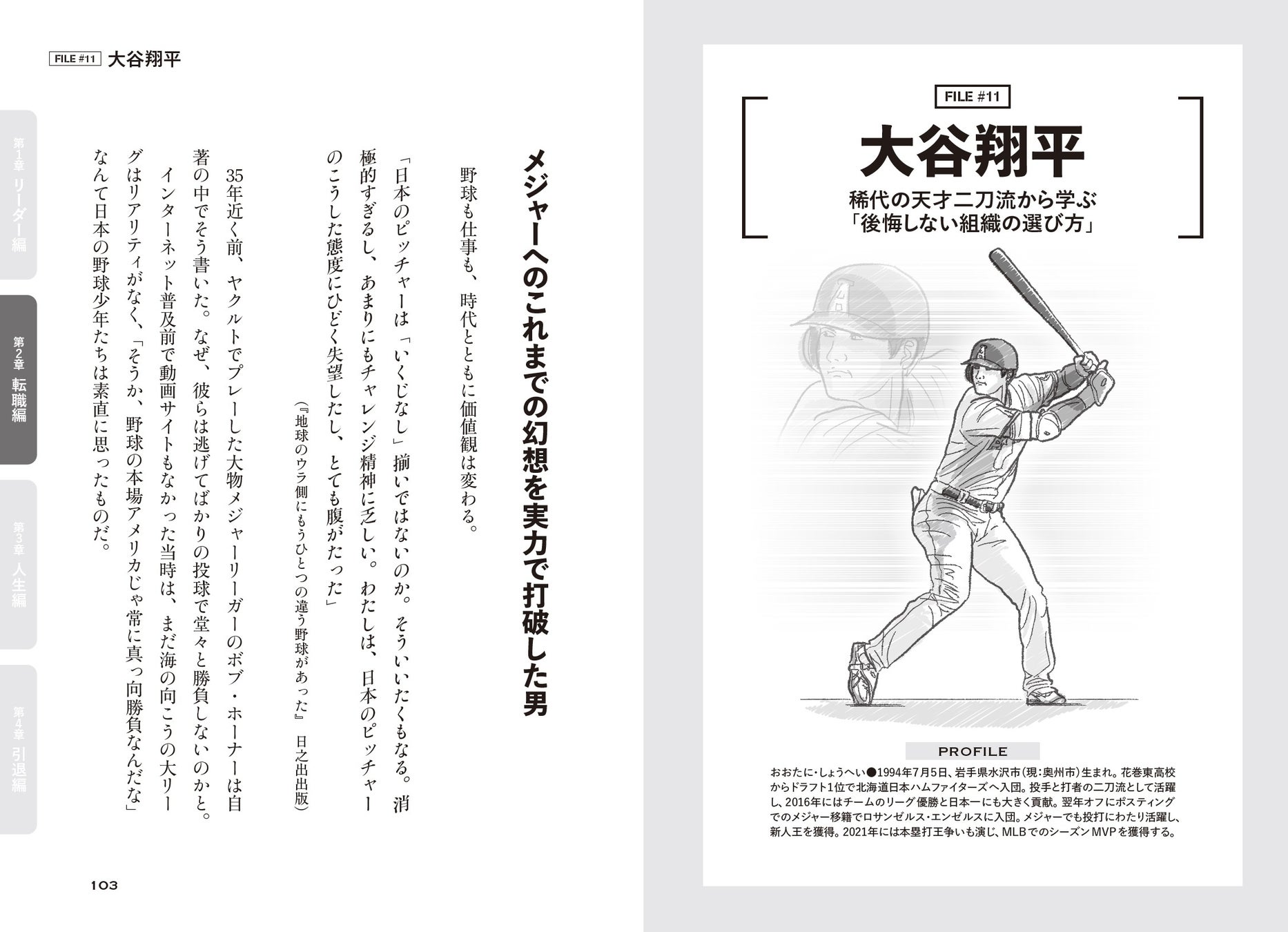 大谷翔平、栗山英樹、坂本勇人、新庄剛志、古田敦也、高津臣吾、吉井理人、鳥谷 敬、落合博満……など、現役の選手や監督から、かつての名選手まで、24人の野球人の熱い生きざまが本書には詰まっています。