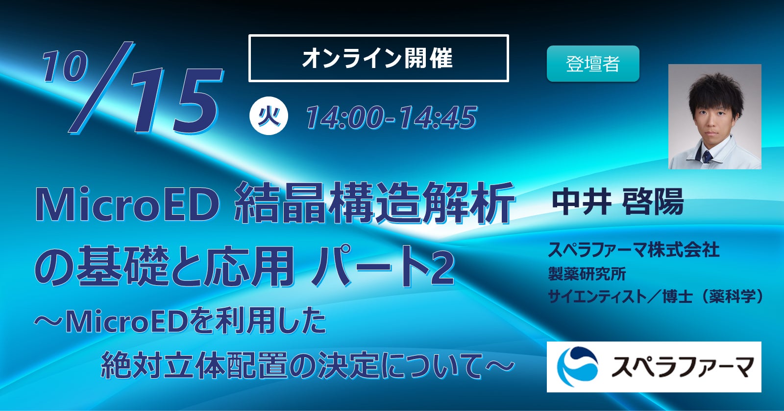 スペラファーマ株式会社(本社:大阪府大阪市、代表取締役社長:岩城 慶太郎)は、2024年10月15日(火)に「MicroED結晶構造解析の基礎と応用 パート2 ~MicroEDを利用した絶対立体配置の決定について~」ウェビナーを開催いたします。