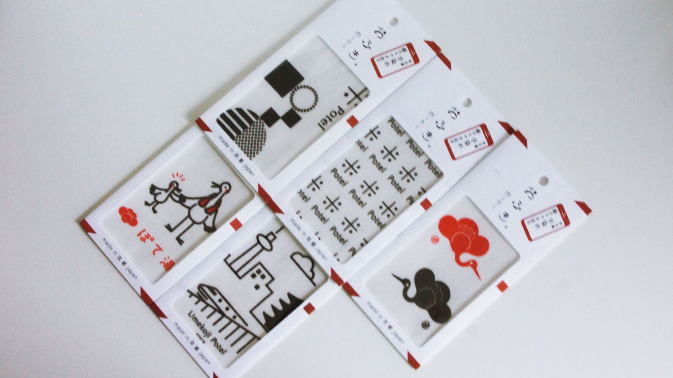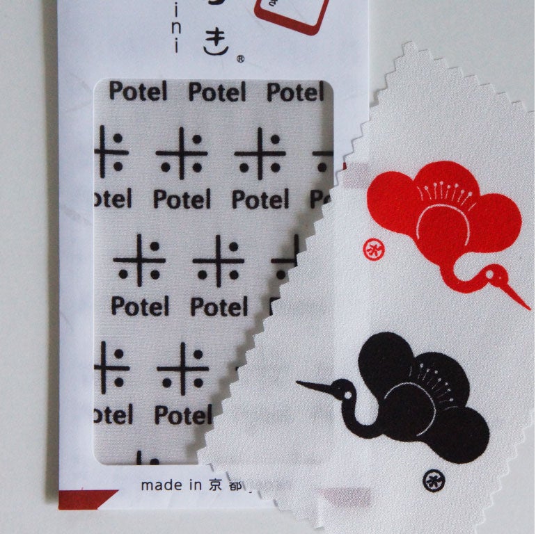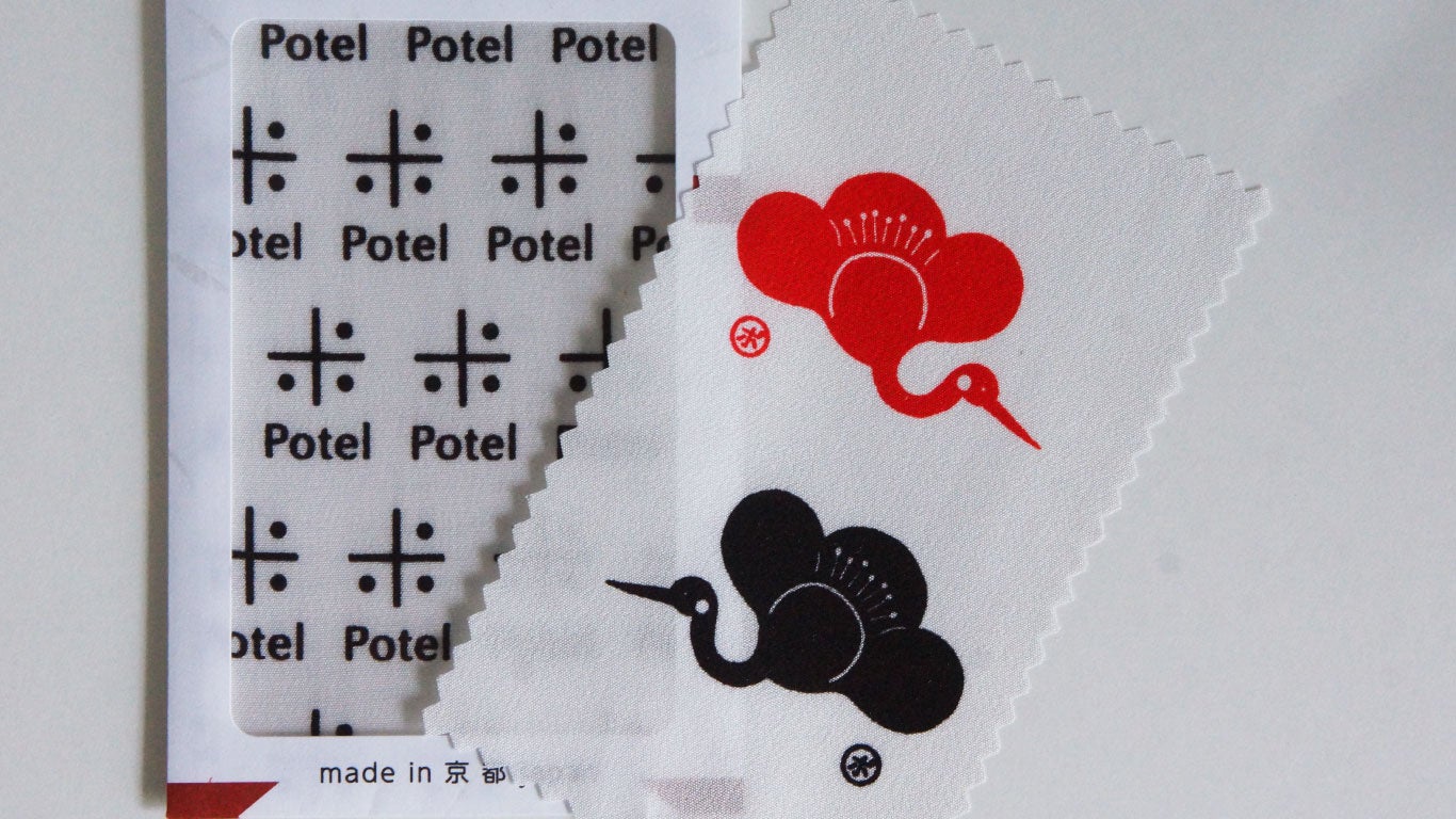 梅小路ポテル京都のブランドカラーであるモノトーンと差し色の赤をベースに、生地は着物のインナーとして用いられる長襦袢(ながじゅばん)で使用されるような柔らかな正絹(しょうけん)生地を使っています。