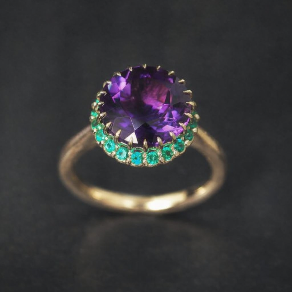 今回のPOP UP SHOPでお披露目されるPomponneでは、透明感をたたえたカシャライ産アメシストを主役にいたしました。濃密で深い紫のなかに、光を受けるたび赤紫の輝きがそっと揺らめきます。さらに、ザンビア産エメラルドの深い緑を周囲に添えることで、アメシストの神秘的な表情をいっそう引き立てております。