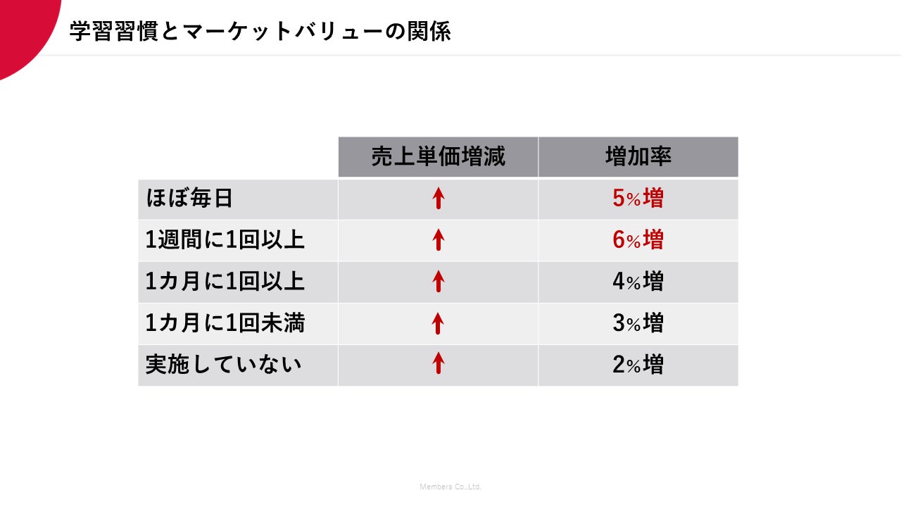 学習頻度が高いほど、一人当たりの売上単価が向上。マーケットバリューが高まっていることがうかがえる。