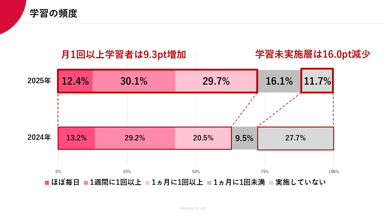 学習を実施していない層が16.0pt減少、1カ月に1回以上は9.3pt増加。1年間で何らかの学習をスタートした社員数が大きく増加。