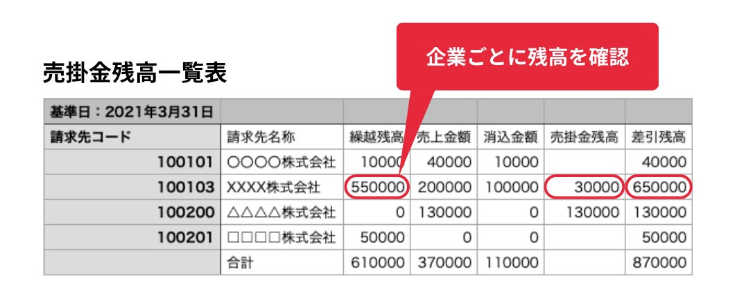 「債権管理帳票機能」では、請求先ごとの繰越残高や売上金額、消込金額、売掛金残高、差引残高を集計した売掛金残高一覧表を出力できます。