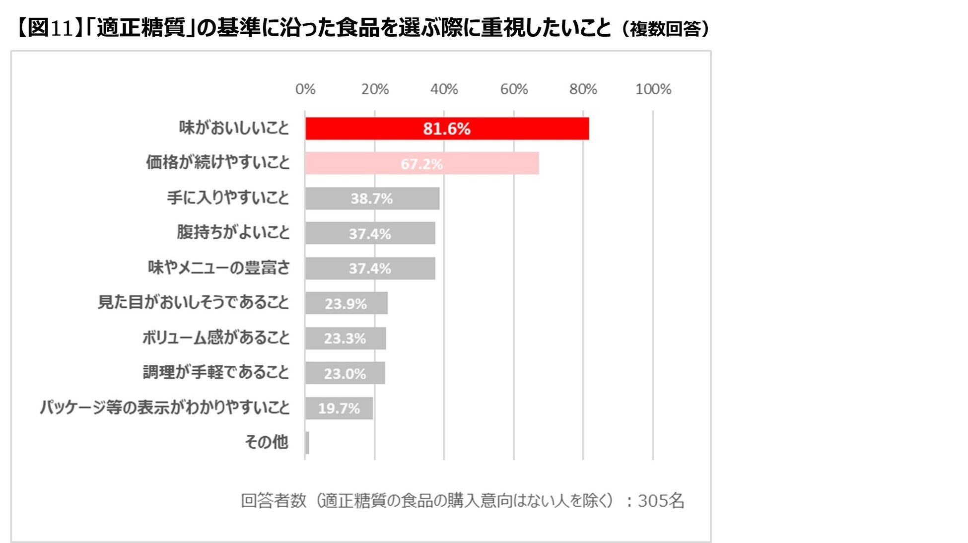 また、適正糖質の基準値に沿った食品を選ぶ際に重視したいポイントとして、1位に挙がったのは「味がおいしいこと」で、他のポイントに大きく差をつけ、81.6%の方が重視したいと答えています。【図11】