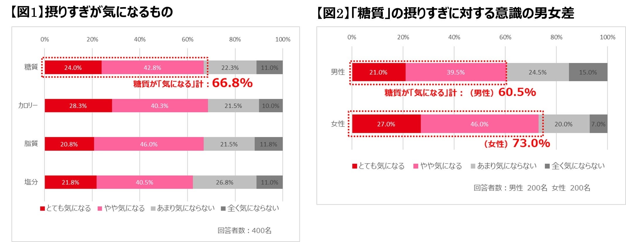 「脂質」(66.8%)とほぼ同水準の関心の高さに。男女別に見ると、特に女性で「糖質」を気にしている