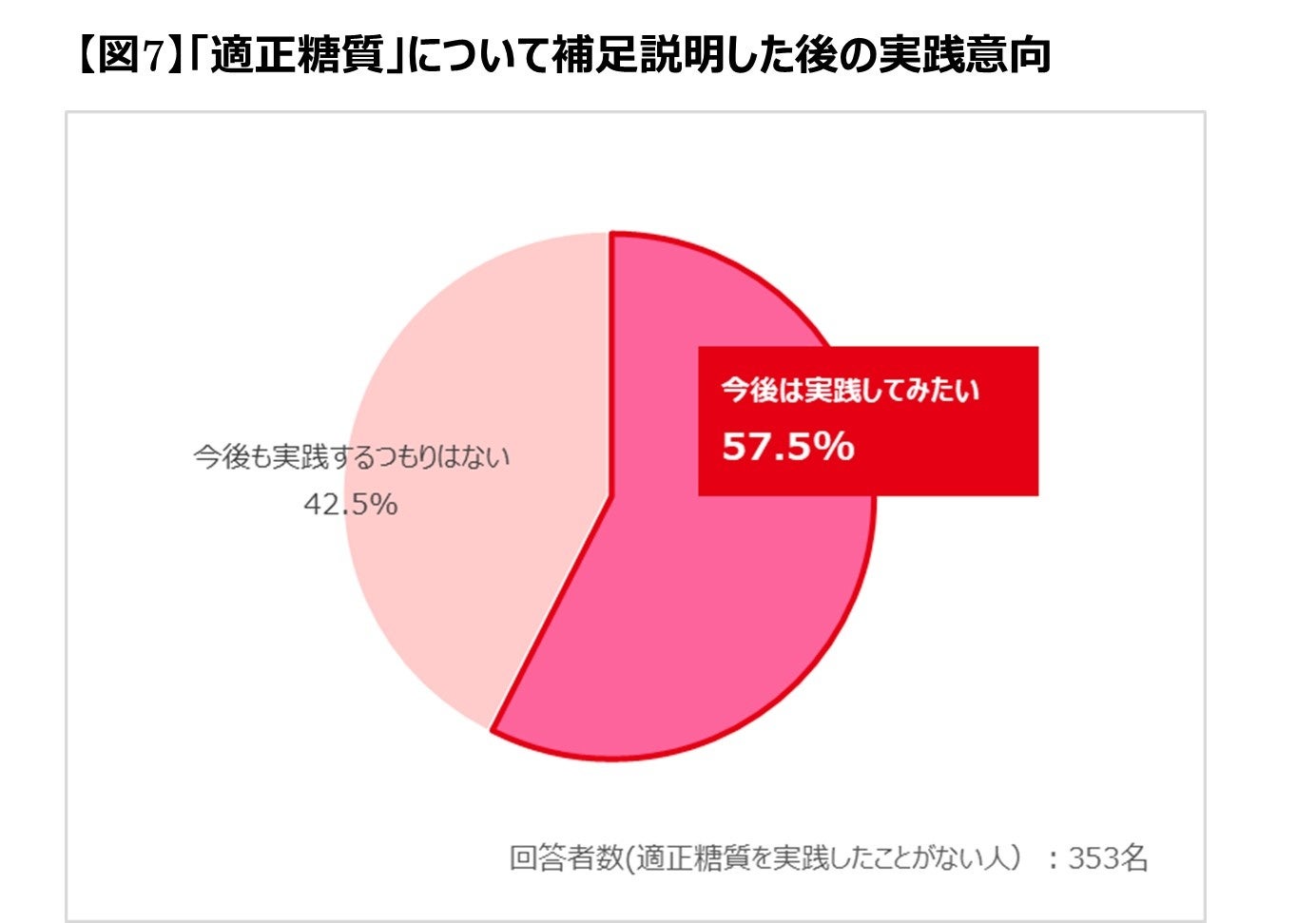 続いて、適正糖質の補足説明として、「肉や魚などのおかずは積極的に食べて良いこと」「間食についても糖質10g以内であれば摂っても差し支えないこと」「適正糖質を意識しながら『おいしく、楽しく食べて、健康になる』ことが推奨されていること」を追加で示した後に適正糖質の実践意向を聞いたところ、未経験者の半数以上、57.5%が「今後は実践してみたい」と回答し、「これなら自分にもできそう(30代男性)」「ストレスなく続けられそう(50代女性)」といった前向きな声が見られました。【図7】