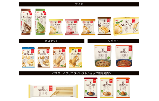 Glicoは、おいしさと適正糖質を両立する「SUNAO(スナオ)」ブランドを展開しています。「SUNAO」が目指しているのは、食べることを素直に楽しみながら、心もからだも健康でいられること。食べたい気持ちに素直になれるブランドとして、2017年にアイス、2018年にビスケット、2020年にはリゾット、2022年にはパスタ(グリコダイレクトショップ限定)をそれぞれ発売し、大変ご好評をいただいております。