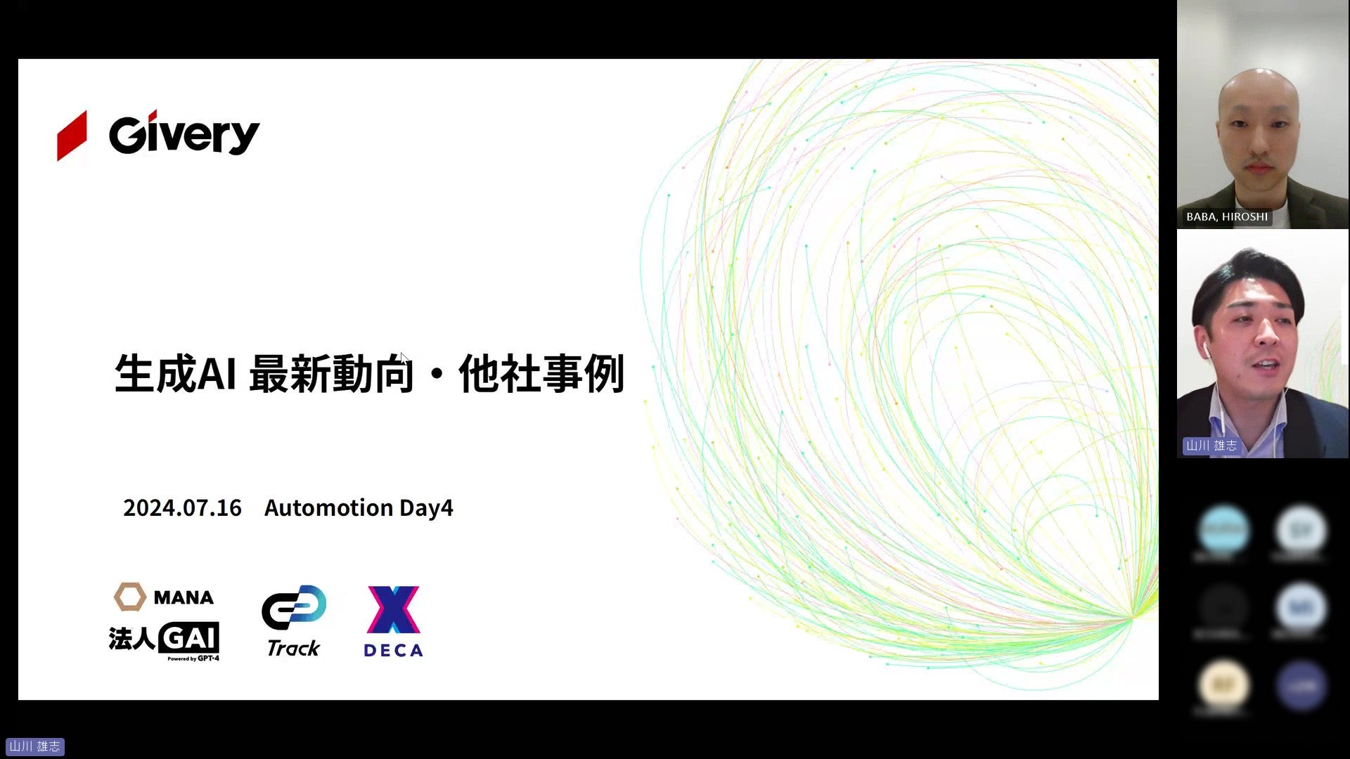 今回の「Automation Day4」では、ギブリー 山川様より、生成AI活用における社外の最新事例やトレンドについて、専門的なご知見をもとに、オフィス業務での活用メリットを知りたいと考えている弊社従業員の目線で講演をいただき、大変感謝しております。