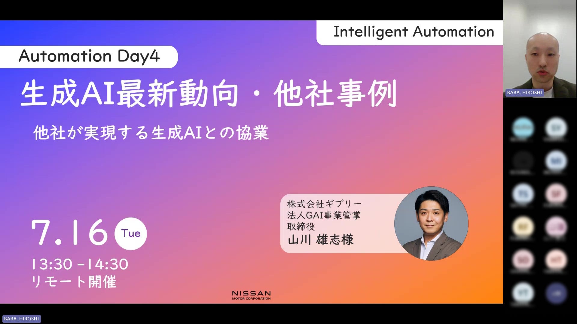 ギブリーのセッションでは、特に「生成AI×ビジネスシーン」の知見と、外部から見た「日産自動車の立ち位置」の講演内容を期待いただき、お声掛けいただきました。「Automation Day」の準備は、イベント開催の約1カ月前から本格化しました。担当者様と数回のオンラインミーティングを重ね、両社の意向を丁寧に擦り合わせながら構築していきました。