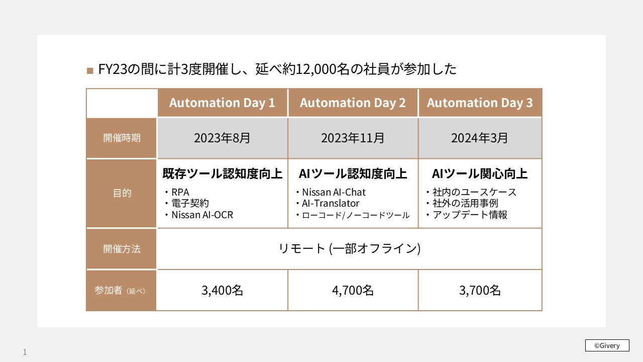 「Automation Day」は、日産自動車が従業員のデジタルツールに対する認識と活用を促進するために行う、社内向けDXイベントです。当イベントでは、最新のデジタルツールのトレンドや機能、社内外での活用事例を共有します。2023年8月に1回目を開催し、以降は、デジタルツールを社内導入するタイミングに合わせ継続的にイベントを開催してきました。今回が4回目の開催となります。