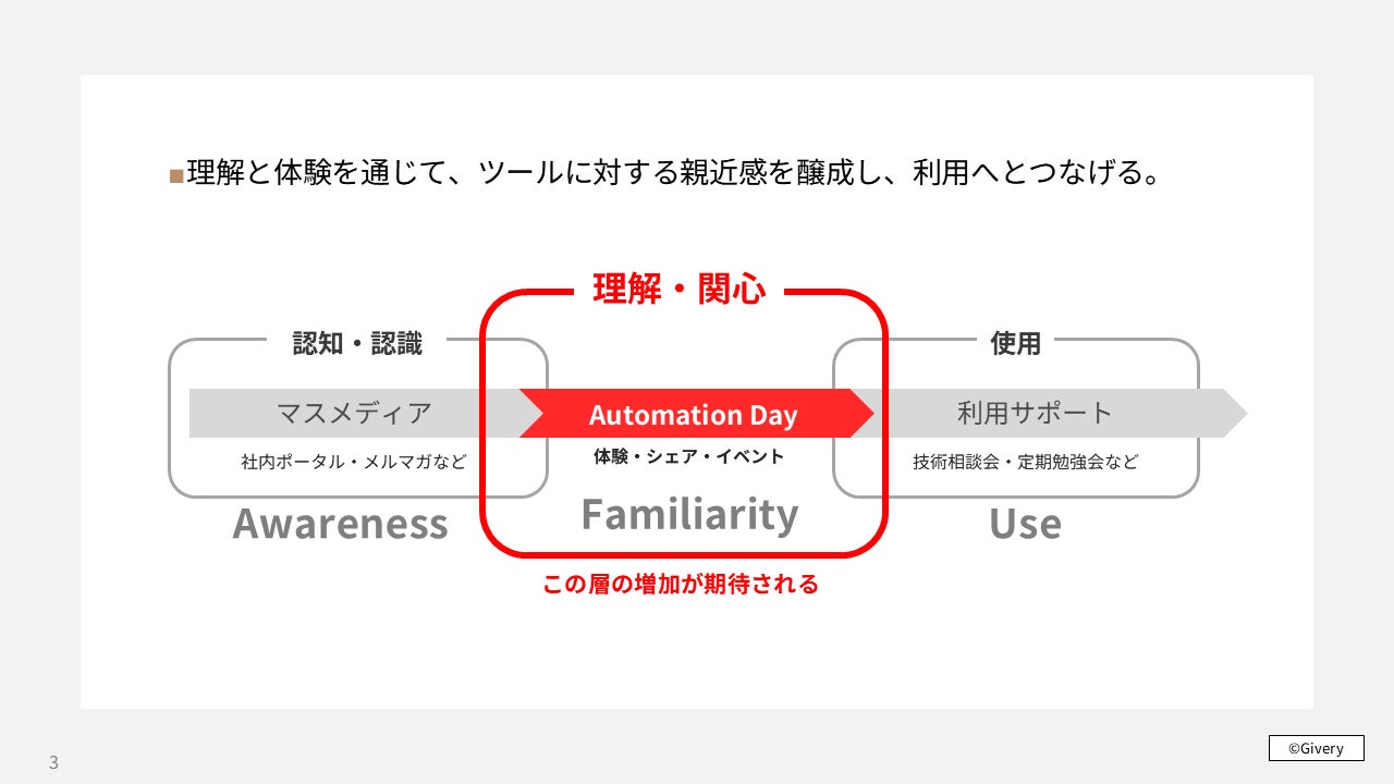 これまで開催してきた「Automation Day」をはじめとする社内周知活動により、各デジタルツールの認知度は大幅に改善しています。本イベントでは、従業員の生成AIを含むデジタルツールへの理解を深め、2つ目のフェーズとなる"Familiarity"層の増加を狙いとしています。この取り組みを継続することで、実業務での活用促進を最終目的としています。