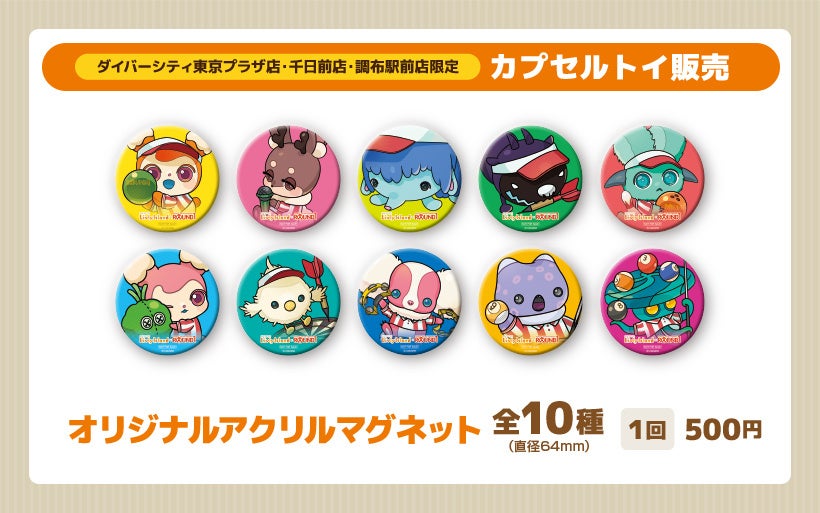 一部店舗限定で「オリジナルマグネット」の入ったカプセルトイやコラボグッズを販売します。なお、コラボグッズは店頭販売のほかに、ラウンドワンアプリでも予約販売を行います。