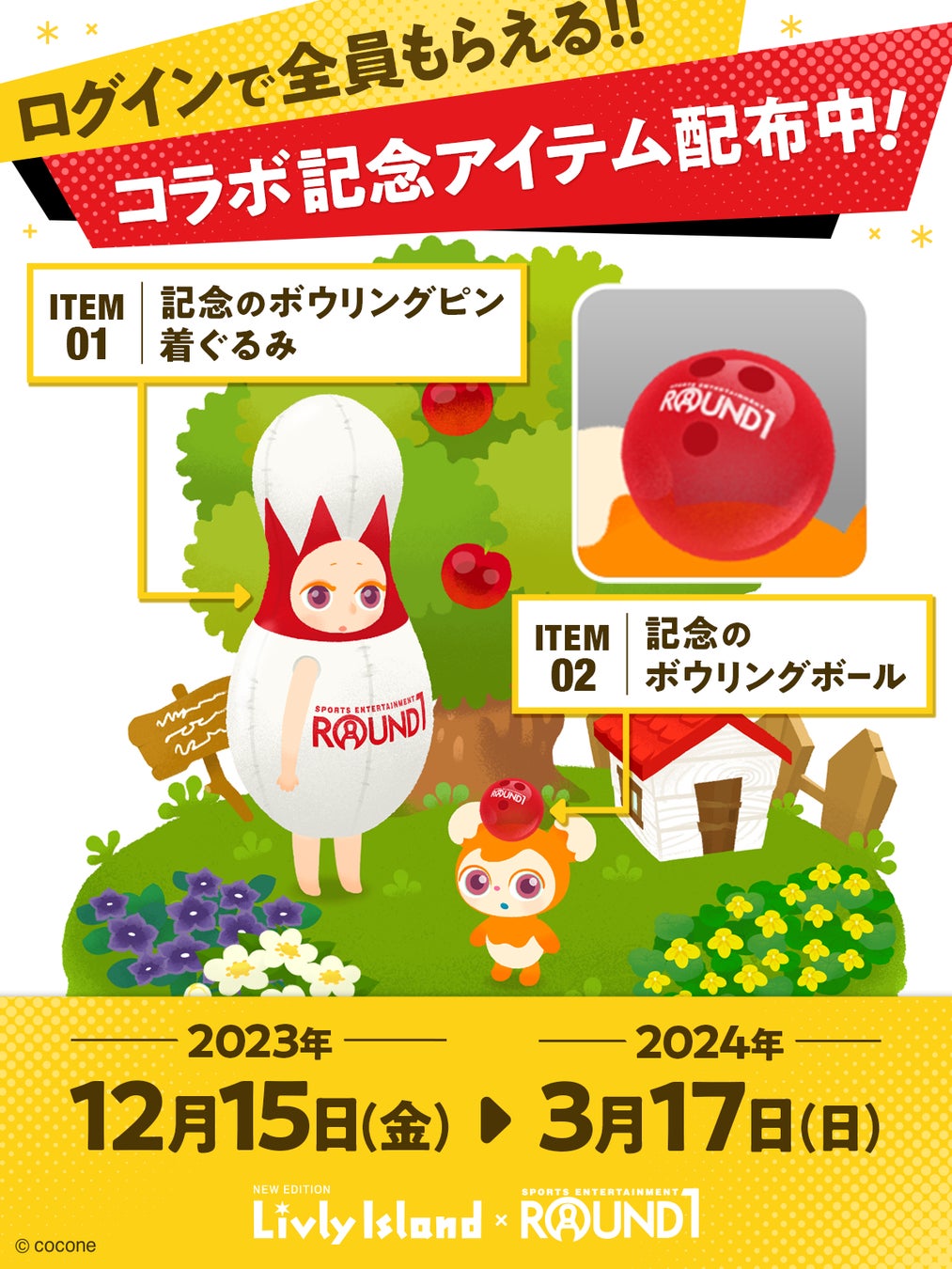 期間中に『リヴリーアイランド』のアプリにログインすると、ホム(アバター)が着用できるファッションアイテム「記念のボウリングピン着ぐるみ」、リヴリーに飾れるアクセサリー「記念のボウリングボール」を受け取ることができます。