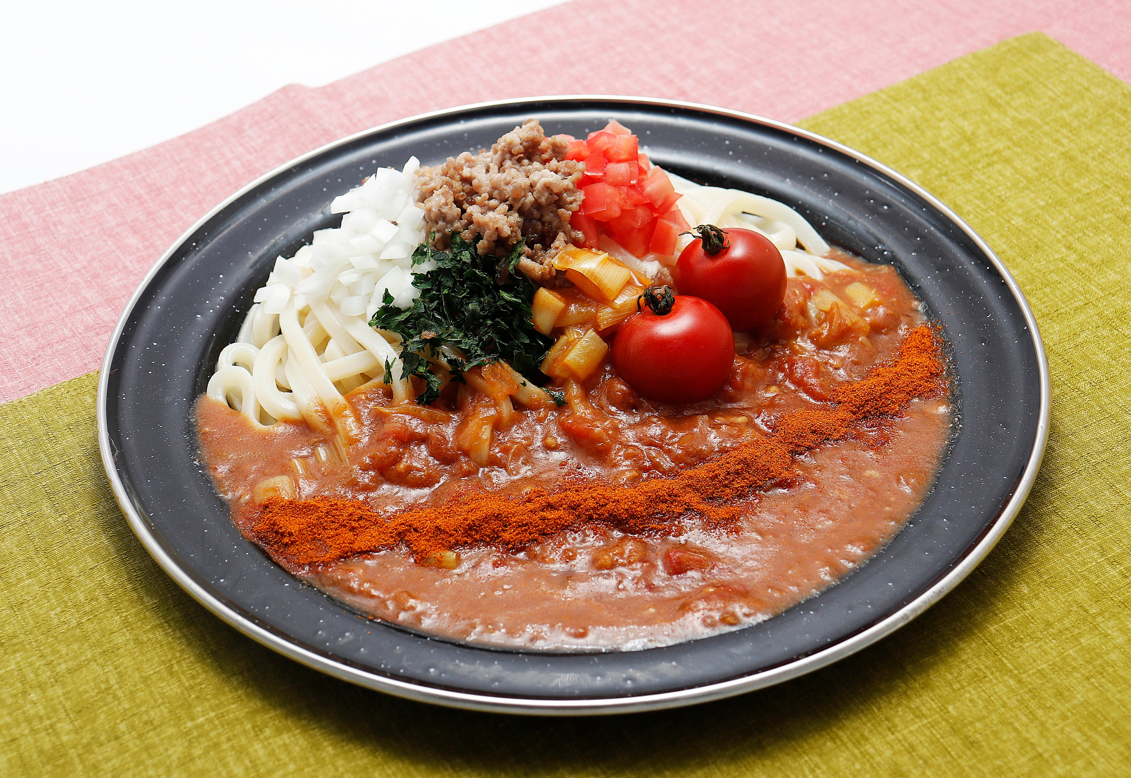 トマトの酸味とスパイスが効いていて病みつきになる悪魔的な美味しさのカレーうどんが出来上がりました!